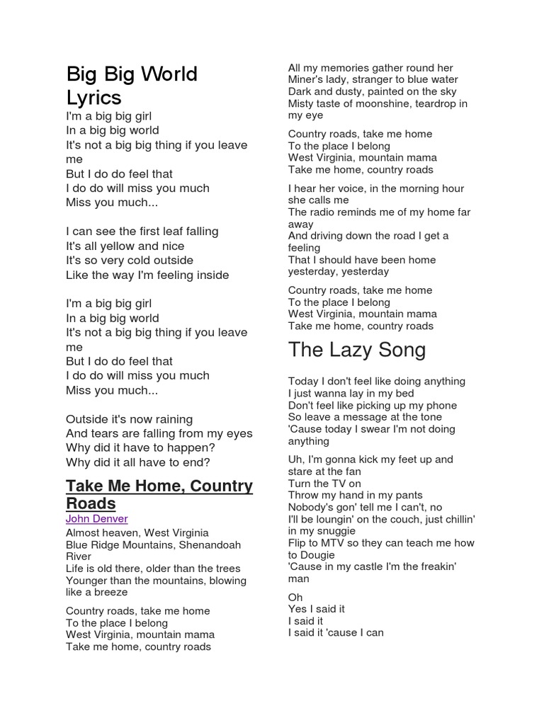 Big Big World Lyrics The Lazy Song Leisure Free 30 Day Trial
